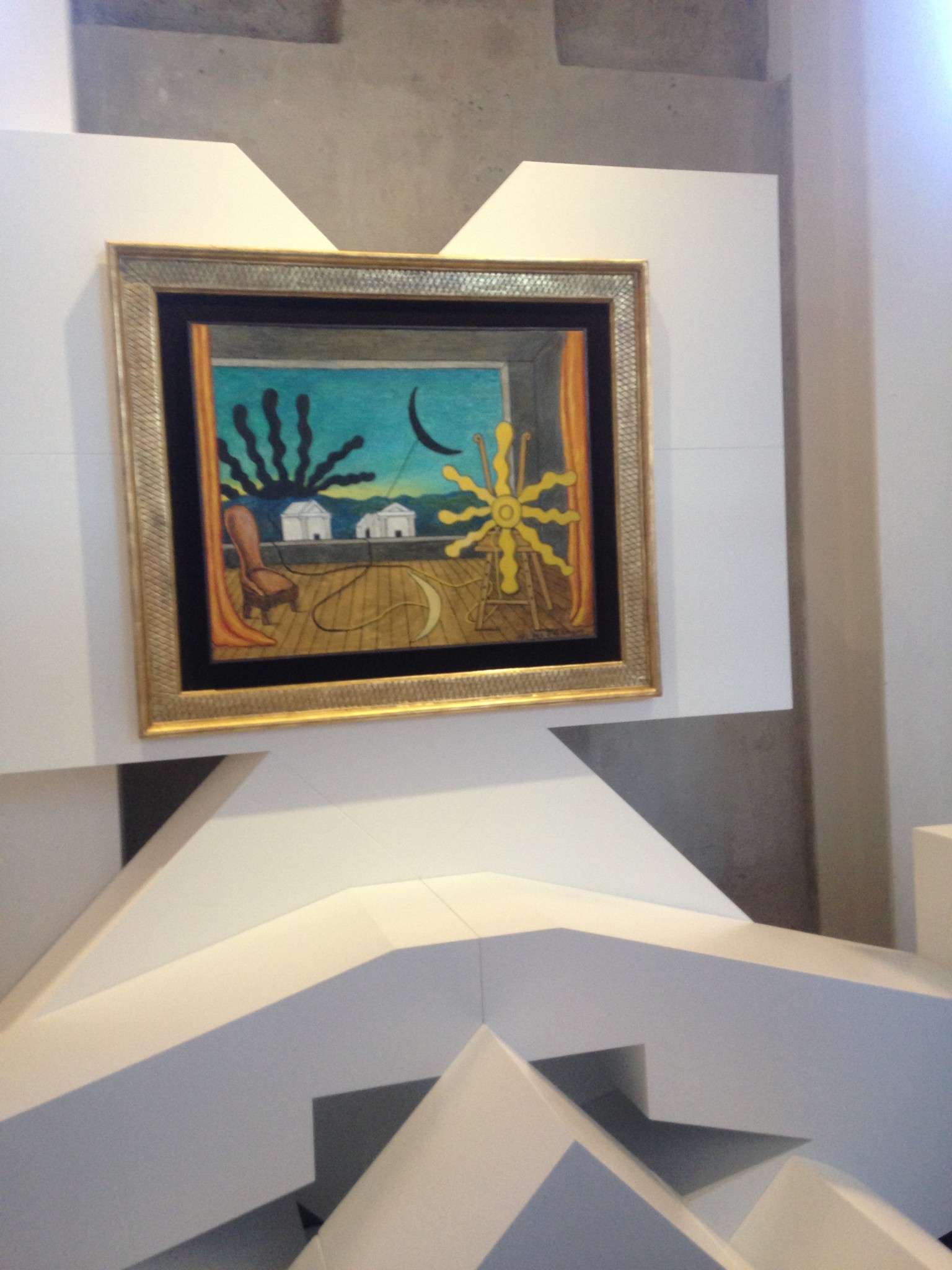 ויזולי מציג ציור של אמנים שונים, אבסטרקטים וסוראליסטים ממוסגרים במוטיב החוזר של תפאורת האבסורד המשחקית- מאיימת. הוא מאפיל ומגמד את העבודות במה שמתקבל כצעד סרקסטי במיוחד. עבודה של דה-קיריקו היא אולי היחידה שמצליחה לשמור על כוחה מול המיסגור המאיים לכלות כל רגישות.