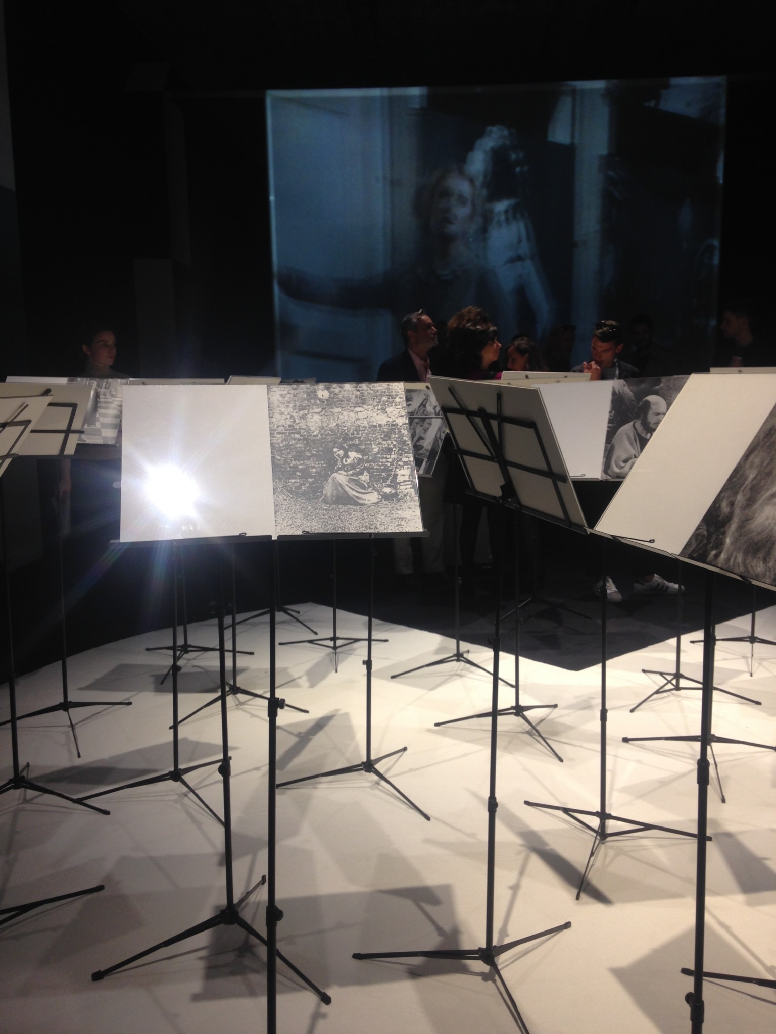 הפסטיש מוקרן במבחר צורות: במסכים קטנים במסדרונות ארוכים ומוחשכים שאחרי זמן תברר לצופה שהם משוקעים התפארוה אבסורדית של מה שנראה ספק אבני משחק, ספק תפאורה של מצודה “עתיקה”, או פריטי עיצוב של “ממפיס” קבוצת העיצוב שנוסדה ב 1981במילנו וסימנה את הפריחה של עיצוב הפוסט מודרני.בחלל אחר מוקרנים סרטים עלמסכים שקופים סביב עיגול מלא בעמודים לקריאת תווים המחזקים , כמו ספר תווים פתוח עם סטיל מסרטים או דיוקנאות. כאן ויזולי מרשה לקטעים לזלוג בצליל והצללות בינהם ויוצר סביבה מתעתעת.