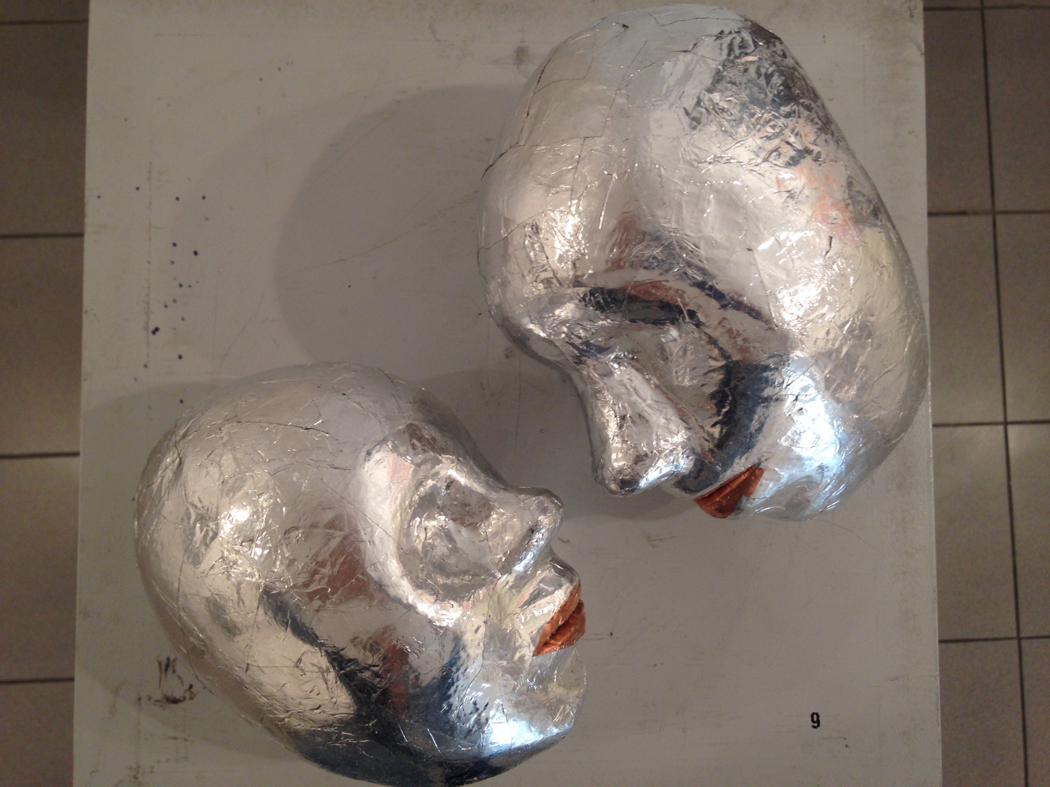 שני ראשים מנייר אלומניום המונחים על שרפרף ניראים כמו התפתחות מענינת של עבודות קודמות של אורי קצנשטיין אך מסתבר שהן של גבי קלזמר. הדימיון הרב בין עבודה של קלזמר לעבודה של קצנשטיין, ממנו היה כל כך שונה בעבר, היא נקודה למחשבה.