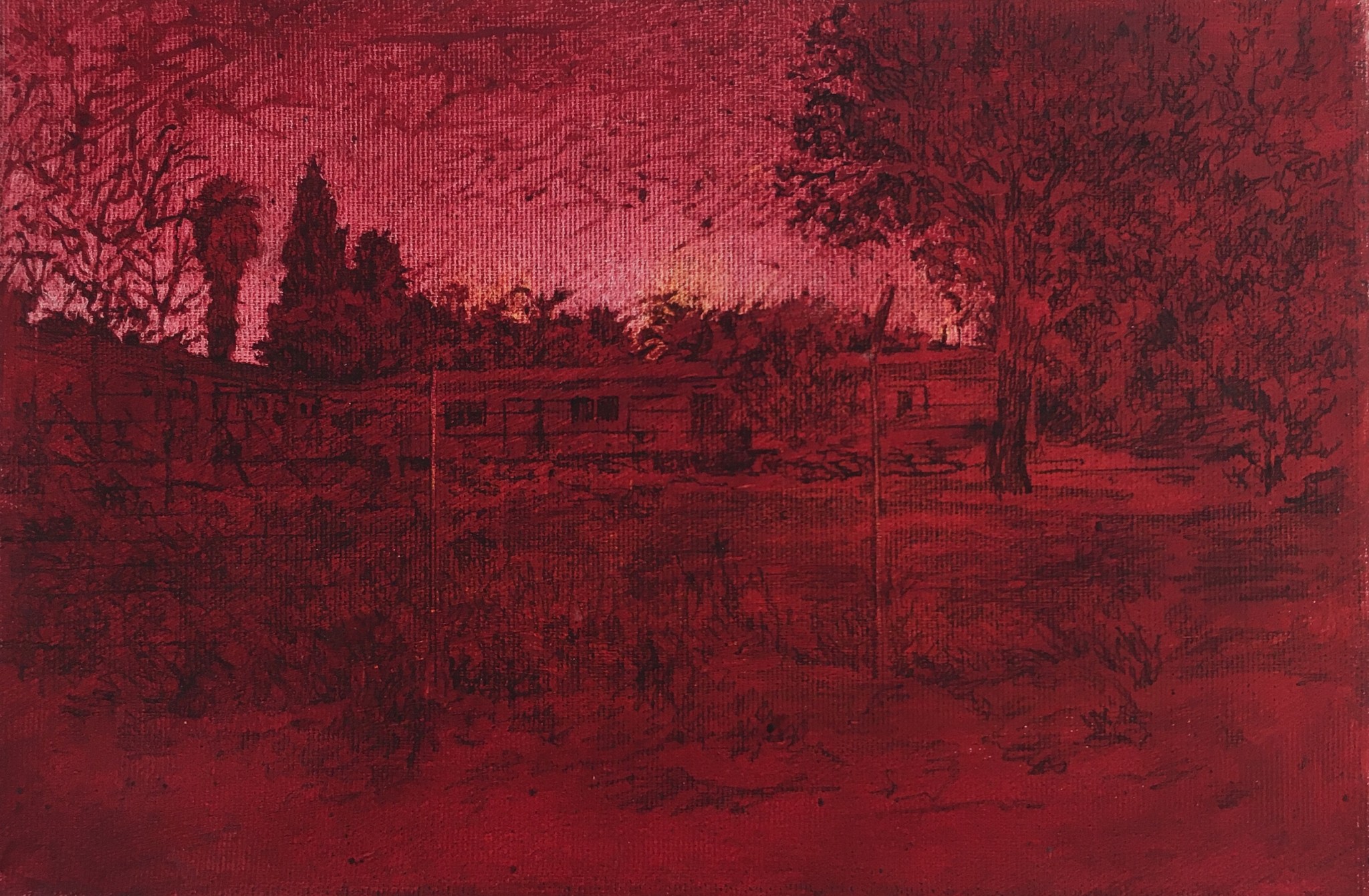 The quality of the flame and high temperature of the color operate like an entity independent of the images. The latter contain a secret, seemingly pastoral, yet transformative and disturbing: a thorny fence stands in front of shingled houses, among the trees villages gradually reveal themselves.