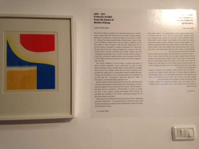 The group of prints by Alima on exhibit at the Almacén Gallery in Jaffa are distinct: created 1969-1972, they are from the Estate of Bertha Urdang, gallerist and pathfinder, an important figure in the history of Israeli art. Urdang, the maternal grandmother of Netta Laufer, curator of the current exhibition, hosted Alima’s first one-person exhibition at the Rina Gallery in 1960. Founded in 1958, the Rina Gallery was one of the few venues in Jerusalem to exhibit contemporary art. Alima was 28 years old at the time, having completed her studies at the Avnii Institute of Art, Tel Aviv, only three years earlier. Urdang, who had championed contemporary art in Israel and later abstract Israeli art in the USA, continued to exhibit Alima’s works throughout the 1970s. In 1972, Urdang mounted a one-person show by Alima at her gallery in New York City, and later exhibited Alima’s works in group shows of Israeli art in museum exhibitions she curated in Albany, Atlanta, and Rochester.
