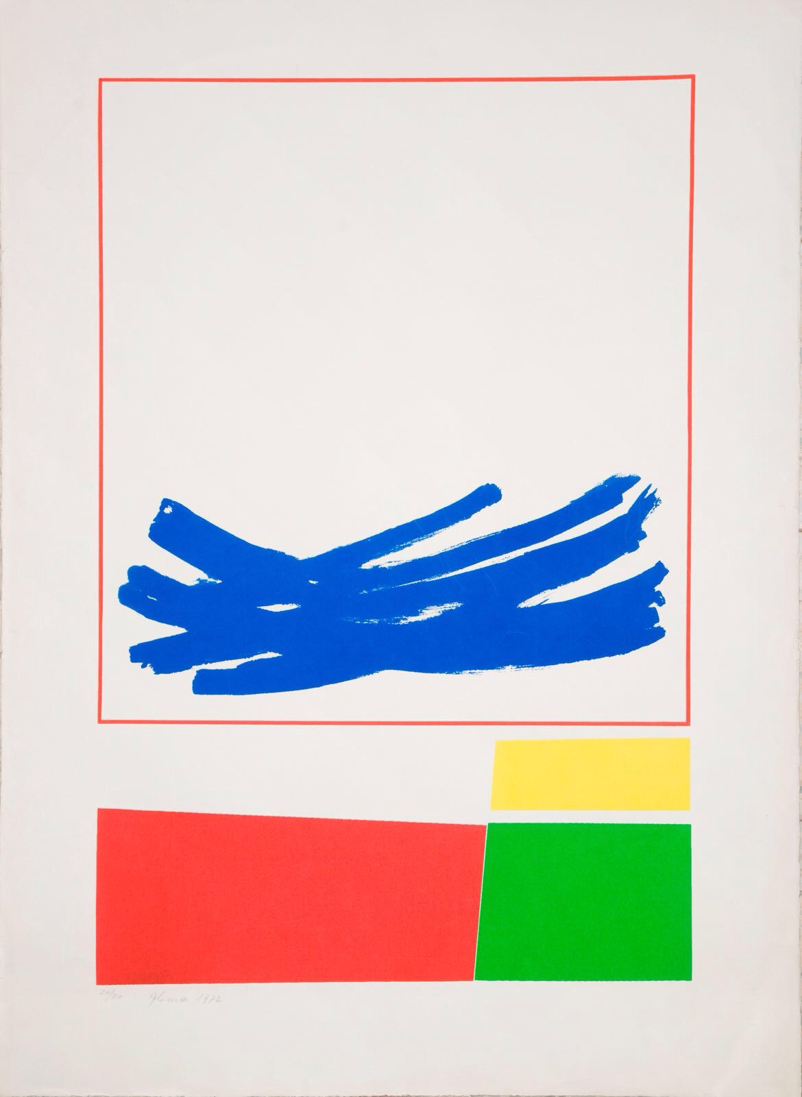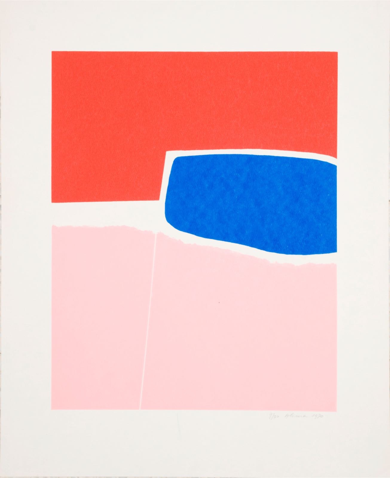 One print in red, blue and pink (1970) is a journey between the orderly and the chaotic. Alima placed two primary colors in a close encounter alongside a saccharine pink, with (nearly) straight lines near torn edges. Nothing in the print is whole. A hairline crack in the pink surface predicts future breakage.