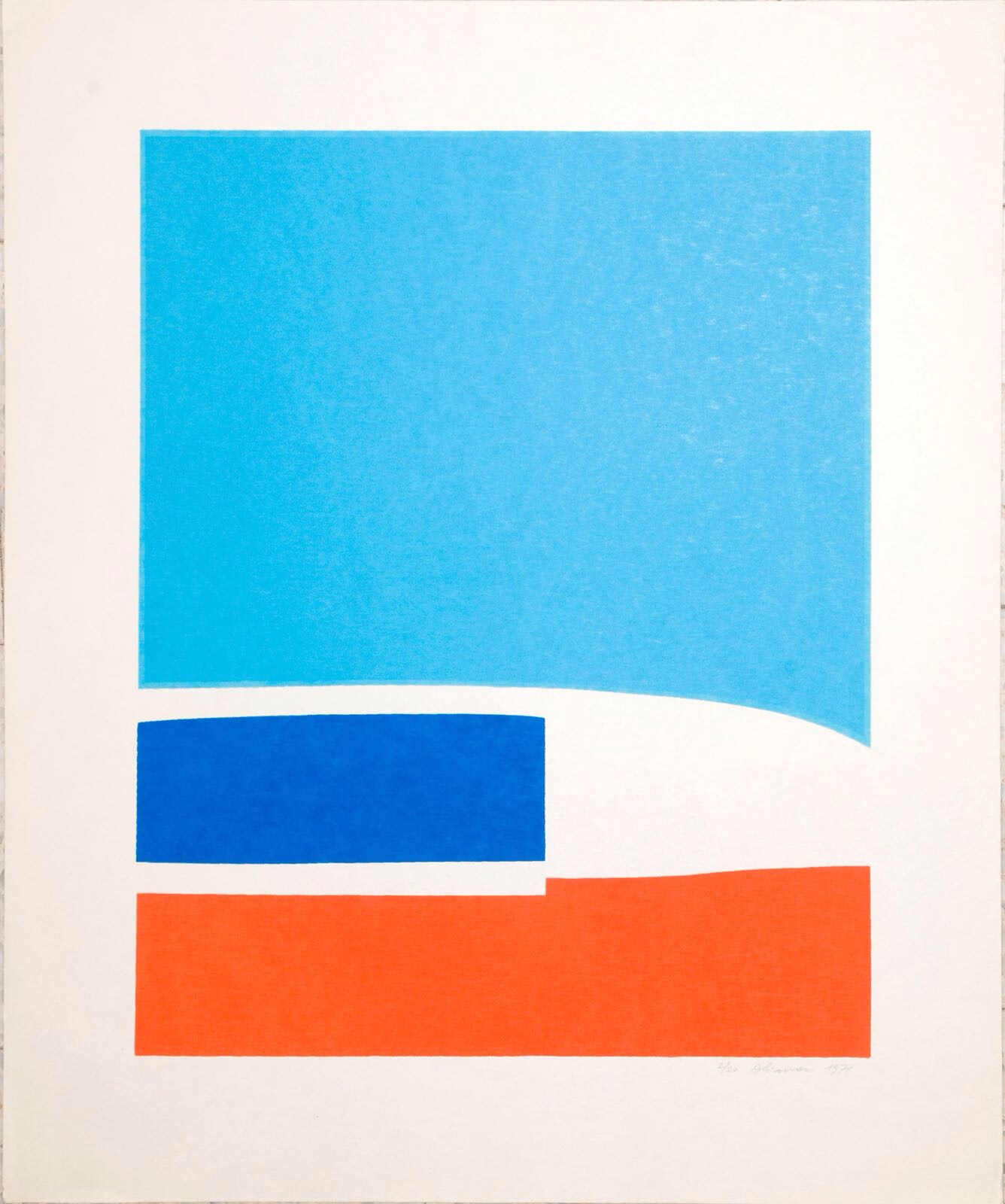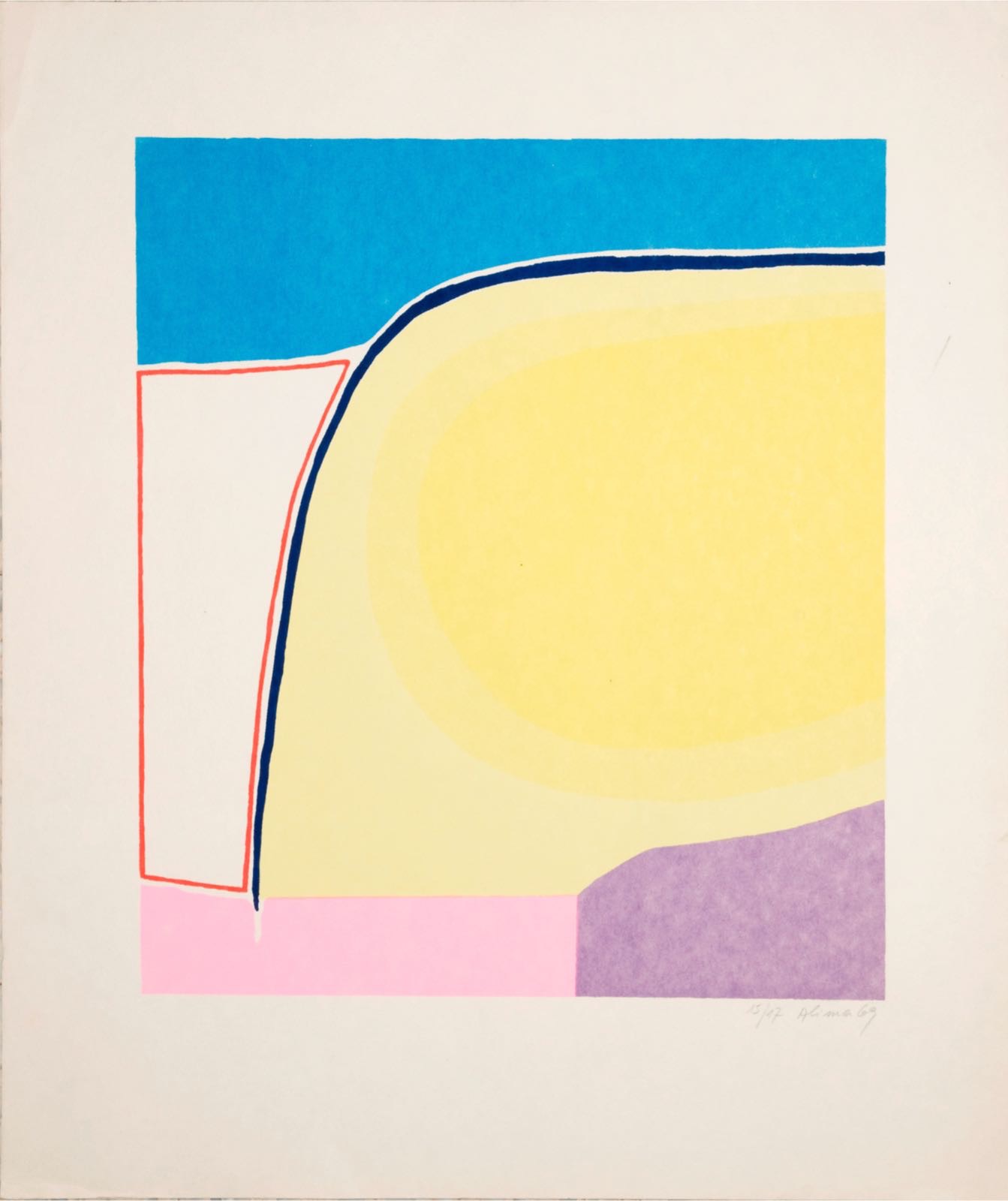 Alima’s works are demanding, devoid of narrative and symbols. They are not easily deciphered. Their immediate associations are to Modernism in its various forms, resonating with Early Modernism and especially Color Theory, close to the engagement with spirituality, as reflected in the works and writings of Kandinsky, Itten, or Moholy-Nagy. The perception of color as a powerful entity impacting the world arises from the works, which at first sight can seem innocent and even childlike. The influence of Matisse (especially his late papercuts), Jean Arp and Picasso (perhaps also Joseph Albers and Sonia Delaunay) are evident, as well as their association to American “color field” artists such as Kenneth Noland and especially Ellsworth Kelly. In the Israeli context, Alima was usually grouped with artists influenced by Michael Gross and Uri Reisman, but in the prints from the Urdang Estate, the association to international art stands out more. It seems that Urdang as a gallerist operating on the seamline between local-Jewish and international, sought and found these sensitivities in Alima’s work.