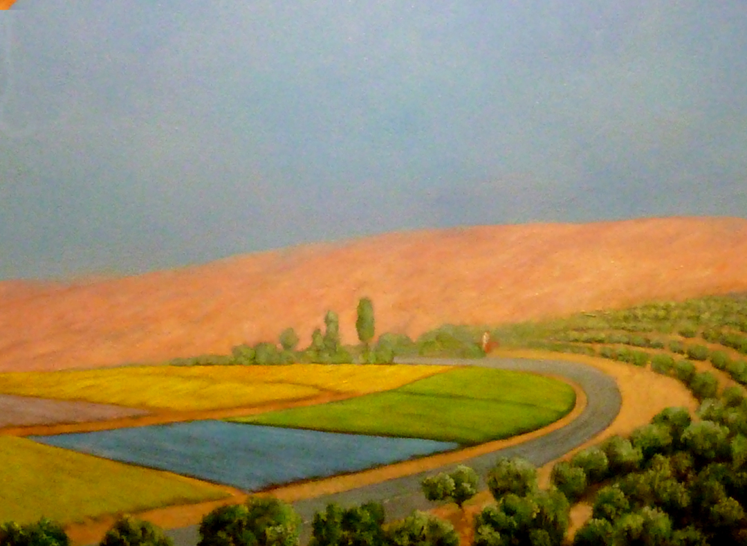 like the Jezreel Valley on a clear day. The skies are a dreamy, cloudless blue, with colorful rectangular fields, with a chain of sand-colored mountains in the distance. The alienation of the landscape from events taking place within it emphasizes Nature’s indifference to human drama, signifying its triviality in relation to the long processes of the universe. This relation between background and events is much more characteristic of Okun’s work than the stormy, darkening skies in the “Women Riders,” which reinforce the volcanic eruption of the work. In all of the other works in the exhibition, Okun has painted perfect sunny days.