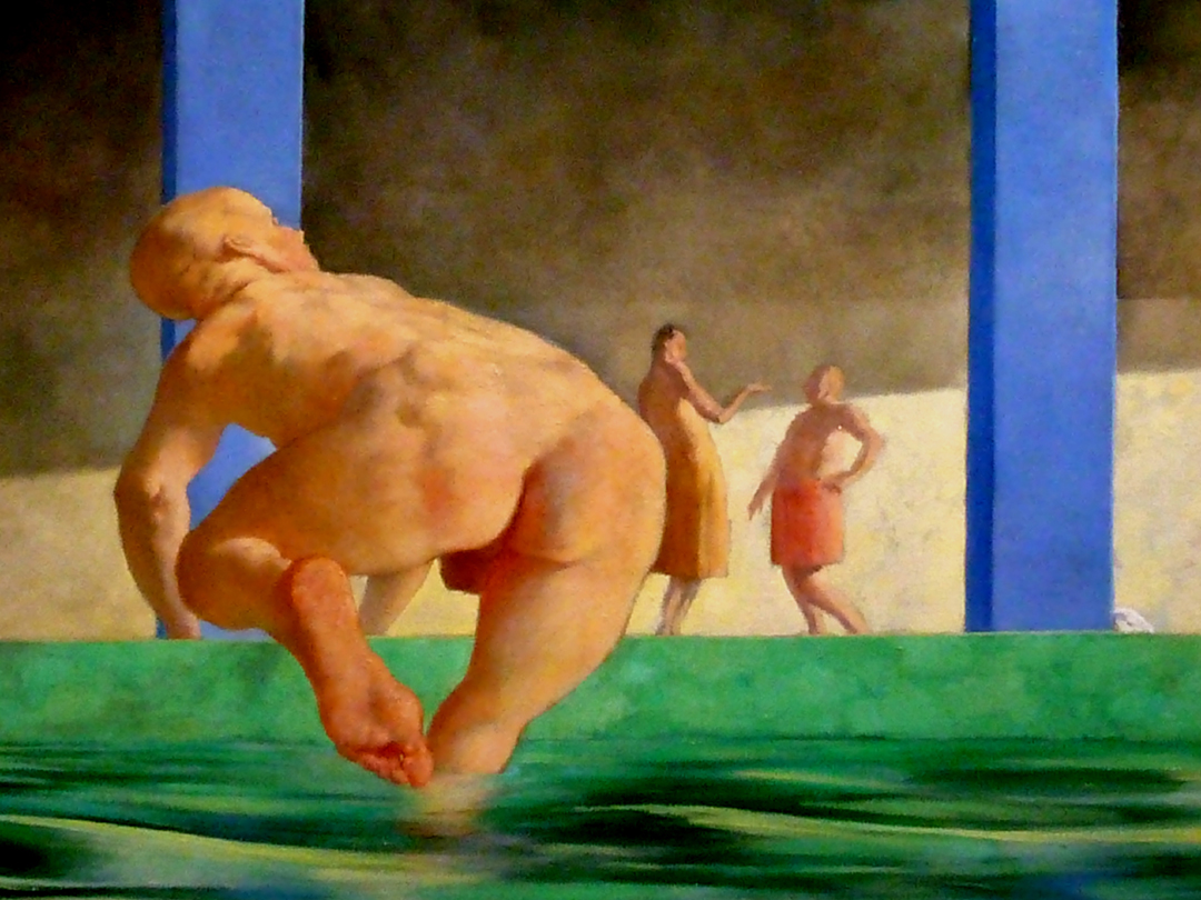 בנוי אך הוא למעשה דיפוזי: ארבע עמודים כחולים מסמנים חלל אך אינם תומכים בדבר,מאחור מה שיכול להיקרא כחומה או קו מתאר של נוף צחיח. מהברכה הירוקה נראה רק קטע קטן בלבד. רחצה ריטואלית, מהטבילה הנוצרית ועד לטבילה במקווה היהודי היא האסוציאציה המידית. העירום מעלה על הדעת בתי מרחץ. גם בסצנה השלווה לכאורה שני גברים מתמוגגים במים, ומאחוריהם מחוץ למים גבר מתמתח ואחר יושב בכסא לא נעלם הטון האירוני.