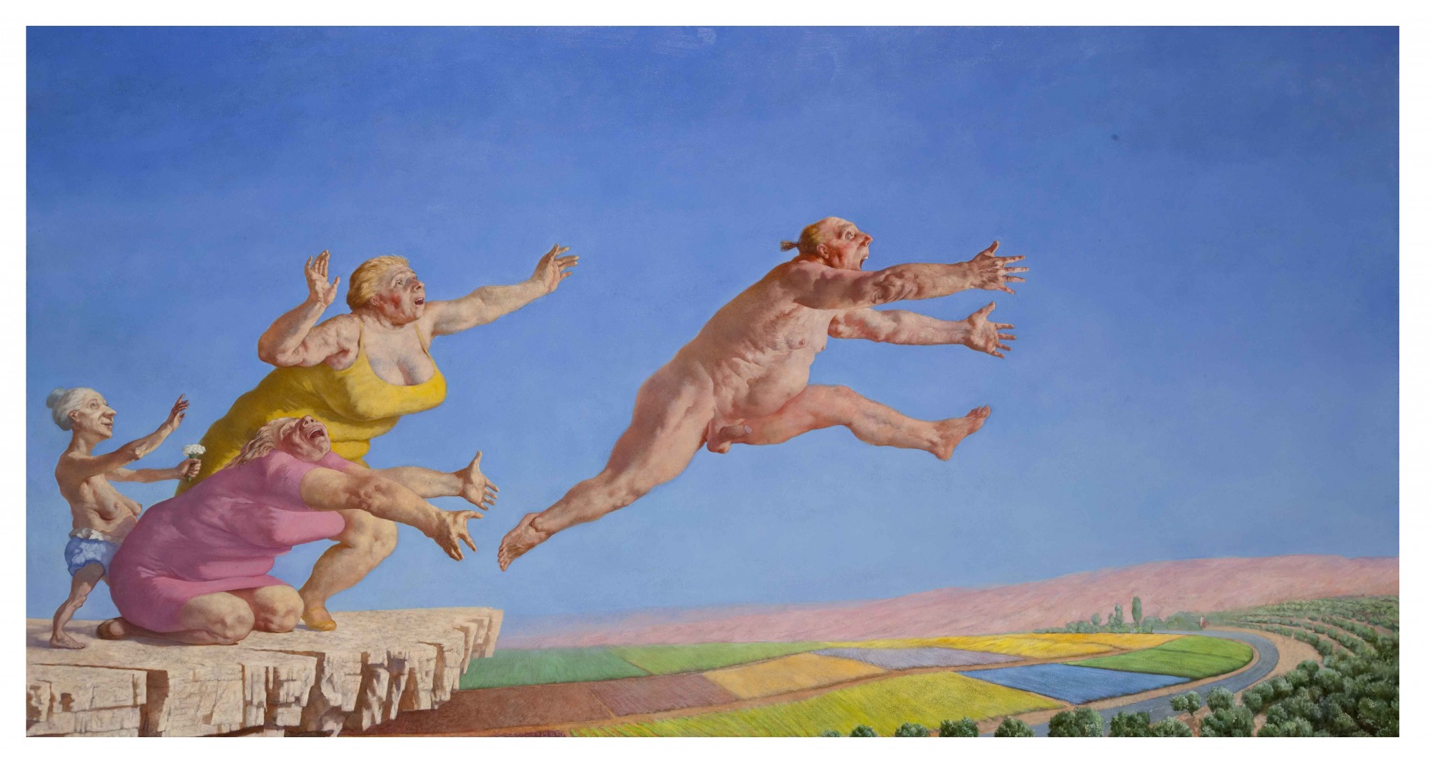 The large-scale, colorful “Successful Escape” is a painting of a moment of the suicidal and the sublime – a threatening combination, since it is unrestricted by morality or fear. A large man, a hybrid of a Gargantua (Rabelais’s 16th century image) and Disney’s dancing hippopotamus from “Fantasia” leapsover an abyss in flight from three women on a cliff. A crash, followed by death, is inevitable, but no sympathy or identification with the man results, except for a frisson of shock.