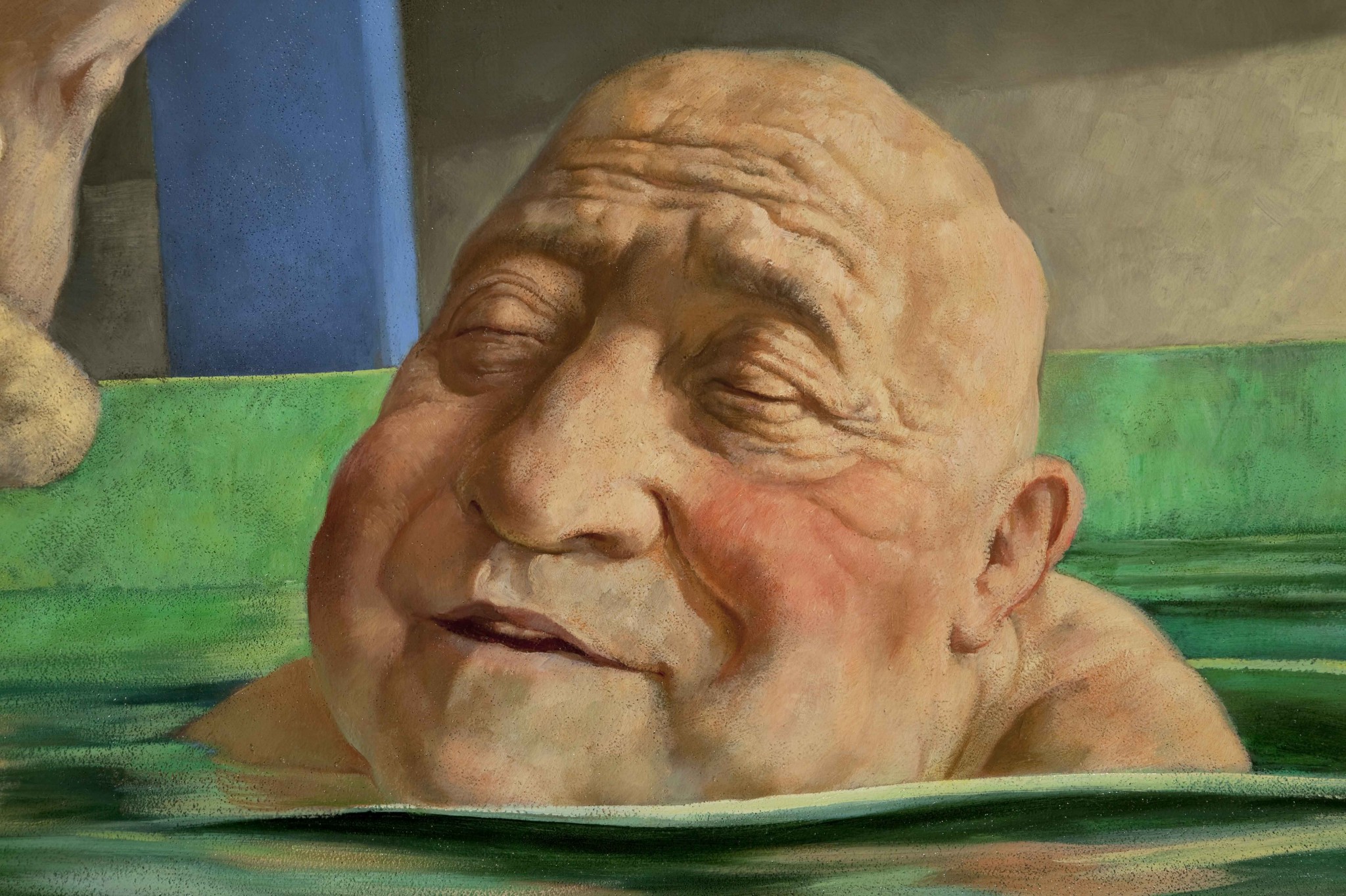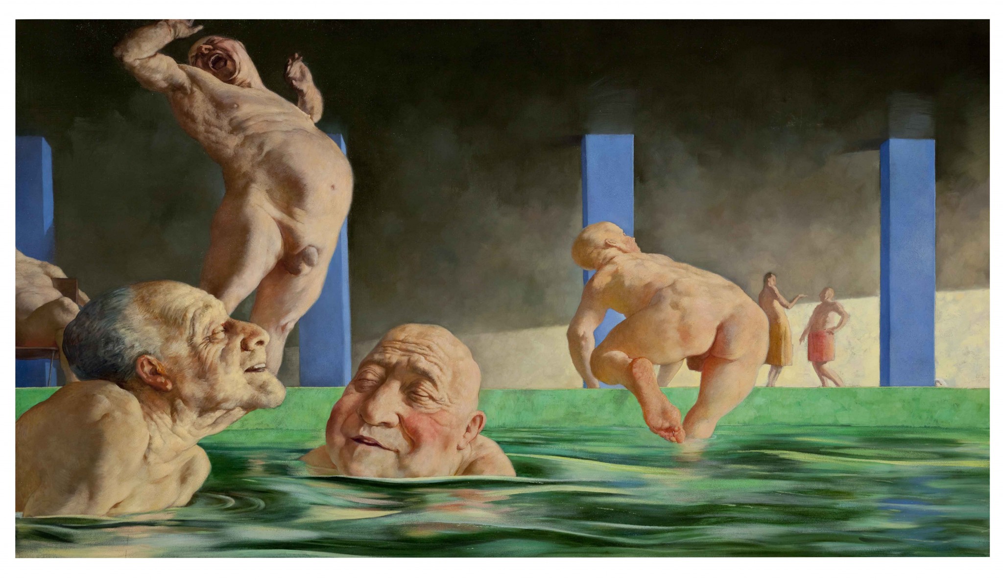 new works. Although it is an architectural space in the sense that it is constructed, it is actually diffuse: four blue pillars signify a space but support nothing. To the rear is what may be read as a wall or the contour of an arid landscape. We can see only a small section of the green pool. The immediate association is to a ritual bath, from Christian baptism to the Jewish mikveh. The nudity is reminiscent of the bathhouse. The seemingly peaceful scene features two men melting pleasurably into the water while behind them, outside of the water, one man stretches and another sits in a chair. An ironic tone is present in the depiction of the worn-out bodies with empty skin. The scene is more of an escape than a purification.