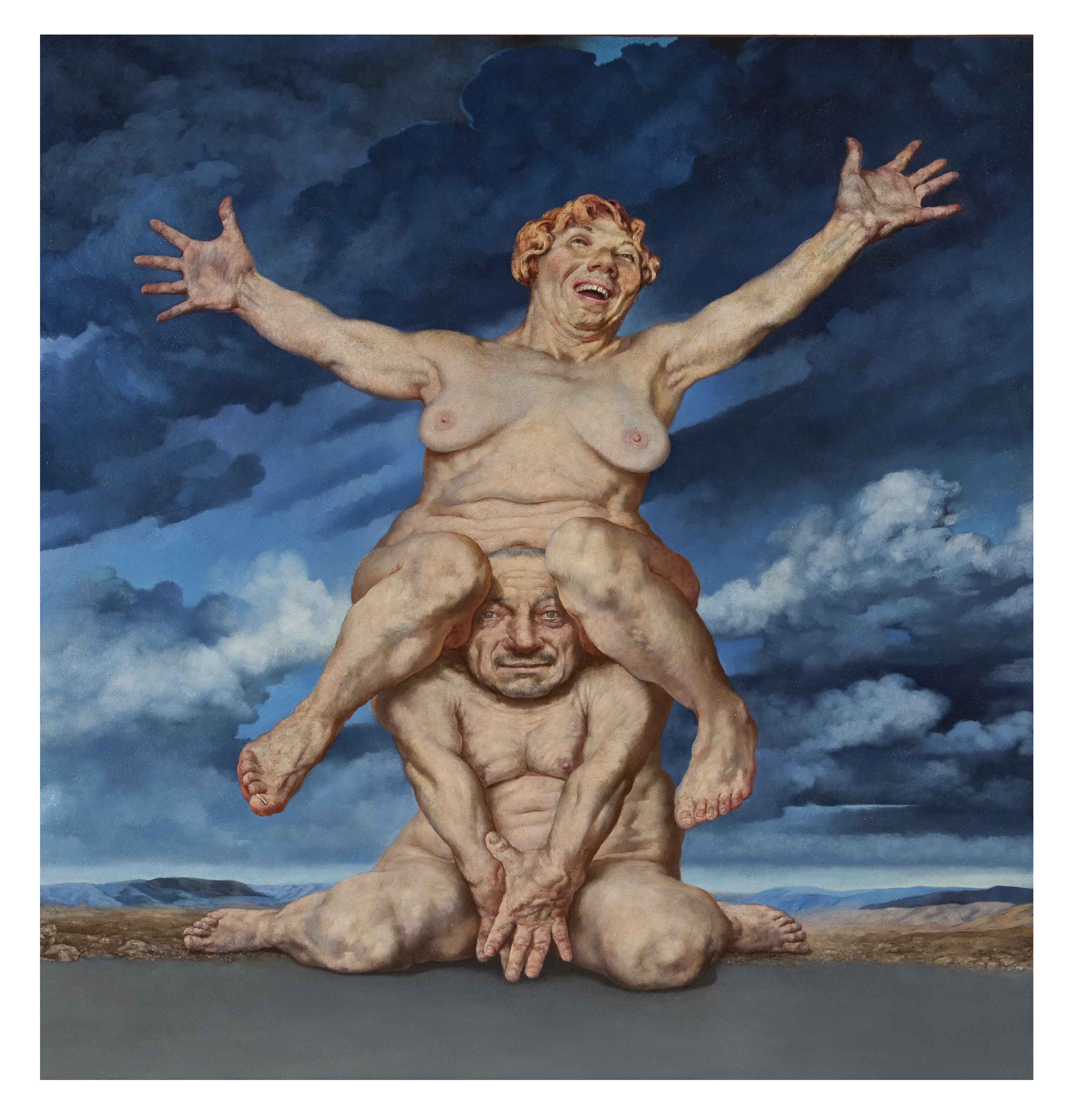 Okun’s women give rise to associations with Marini’s figures, but instead of horses, they are riding on the men. The large, Valkyrie-like women are not bearing dead heroes from the battlefield as in Wagner’s operas, but instead are grasping submissive men under their legs;intoxicated with power, they celebrate their victory euphorically. Something about their figures also suggests associations with twisted birth, women giving birth to elderly, ridiculous men, in a scene that can only be bad news.