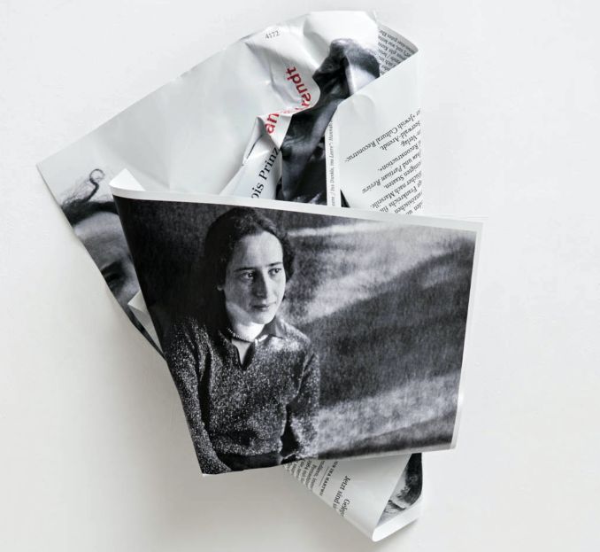 Five large folded metal works are installed on the walls, looking like discarded paper notes, at a distance from the sculptures, but facing them. Metzel outlines a bold critique of modernism, referencing, among others, the Shrine of the Book, one of the only projects by Architect Frederick John Kiesler that was actually built, a structure linking modernity and futurism with the historical past, whose function was to provide the basis for the existence of nationalism in the present; Hannah Arendt’s article, “We Refugees” (Menorah Journal, 31, no. 1 (January 1943), pp. 69-77), which defined the uniqueness of the Jewish German refugees; early photographs of the Arendt and of Susan Sontag; photographs of a metal drinking faucet and the back of an anonymous woman in an office.