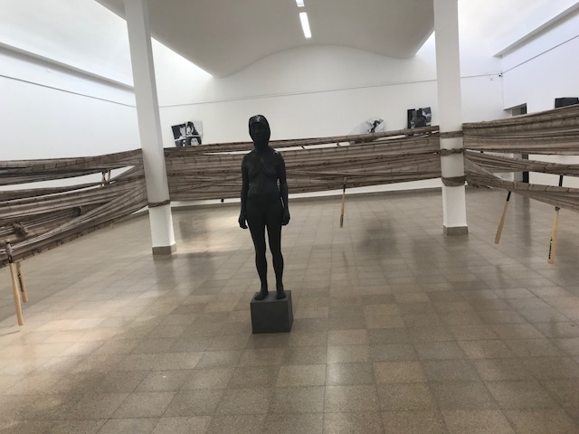The central installation comprises two sculptures: Turkish Delight, 2006, featuring a standing nude young woman with an Islamic headscarf, and Any more questions?, 1998, recreated for the Mishkan Museum, with camouflage cloth binding together several baseball bats. The cloth wraps around four pillars in the center of the hall creating a separate space reminiscent of a boxing ring or perhaps an improvised dressing room. In any case, it disrupts the view of what it contains. The interlacing can hint at a mashrabiya – latticework windows which are an Islamic architectural element – while the slits can be read in the context of the viewing slits in Duchamp’s Étant donnés, 1946-1966. Duchamp gives viewers a glimpse of a headless nude woman, while in Ein Harod the nude’s covered head does not seem to belong to the body. The installation proposes a broad range of issues and aesthetic links: along with the aesthetics of fascism (militaristic uniforms) and the police batons, the bronze statue of the young woman brings to mind sculptures by Wilhelm Lehmbruck (1881-1919) as well as Little Dancer Aged Fourteen, 1881-82, by Degas.