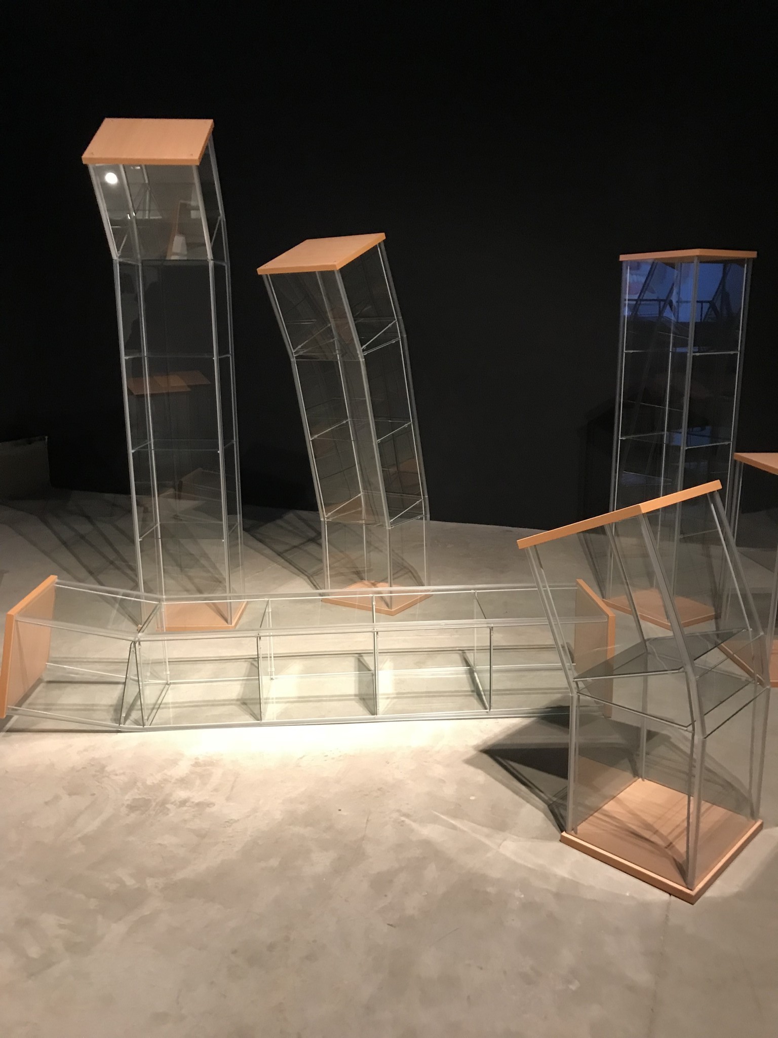 In the center room, the installation “The Ikea cabinet’s final hours,” Frank uses the popular Detolf glass display cabinet through which good taste and the ideal of the good life is replicated through the world. She manipulates the cabinet to transform a standard object into a sculpture, building a complex of “bent over” and “lying down” cabinets as a deathbed scene.