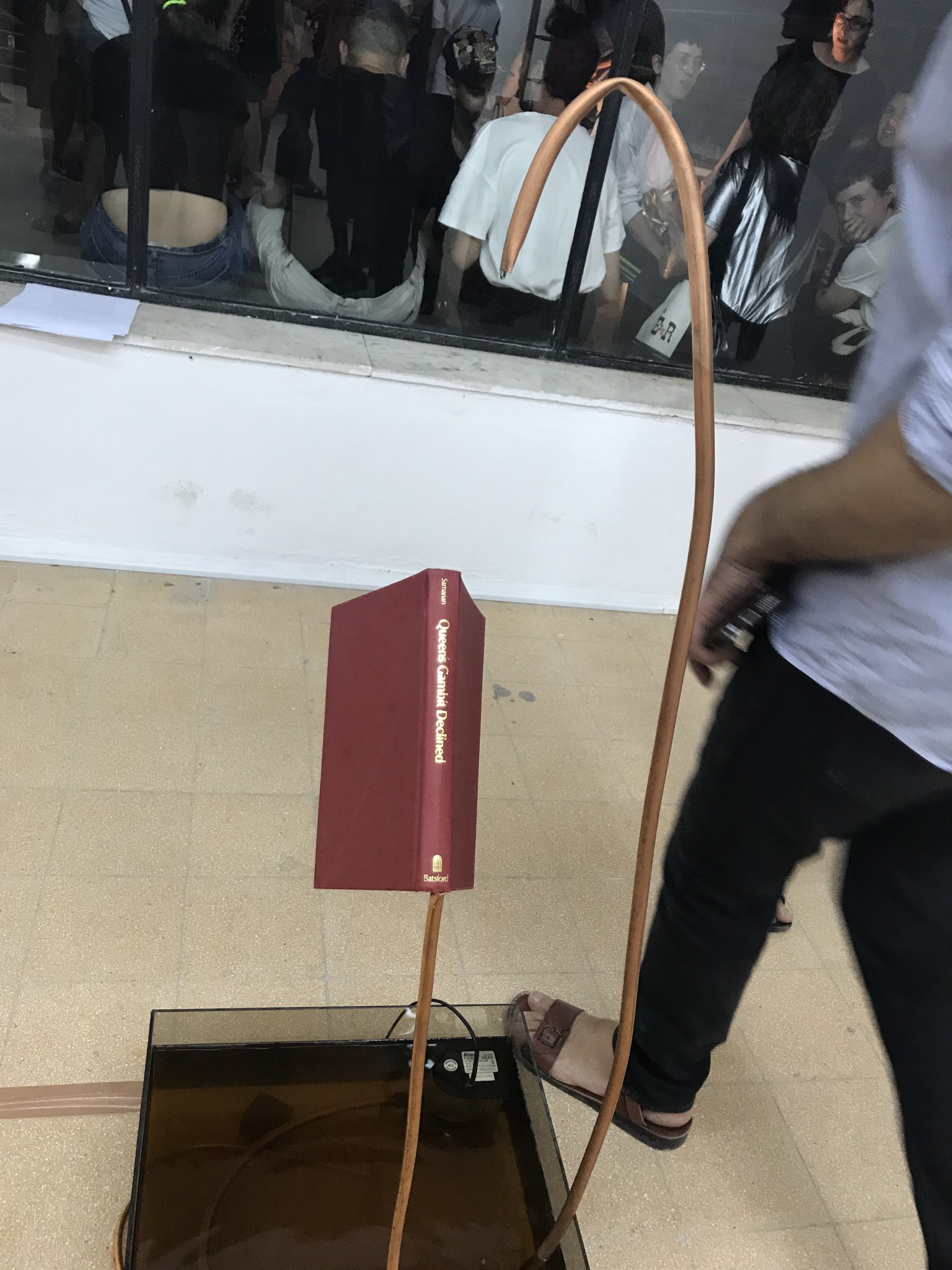 כמו בעבודה של שיזף, המשותף לעבודות הבולטות היא התחושה שמאחוריהן מחקר והתבוננות שאינה קונפורמית, כאשר הצופים נתפסים כשותפים (ולא מושא לחינוך או, גרוע יותר, צרכני פרסומות). במיצב Queen’s Gambit Declined עדי דהן מדברת על אכזריות אלגנטית, משחקית, מרוחקת, ולצופים נותר שדה נרחב ליצור חיבורים להווה. שם העבודה הוא שם פתיחה הנחשבת לקלאסית במשחק שח, בו הצד הלבן מוכן להקריב חייל כידי להגיע לעמדה אסטרטגית טובה מול הצד השחור, ונדחה . דהן יצרה מערך עבודות ששתיים עשויות בנגרות יפה: סידרת חותמות הנראות כחיילי משחק שח, אך אלו יכולים להטביע על דף סידרת תנועות ידיים u תנועות של זקפה, ומשחק בו חייל שח ז’אנרי נופל ברעש רב דרך קוביות שתנועתן מזכירה גיליוטינה. את התמונה משלימה מזרקה בה ספר, שעל שדרתו מוטבע שם המיצב באותיות זהב, סופג ומטפטף רום לתוך אקווריום קטן. דהן הצליחה להנכיח איזו תחושה סדיסטית, דקה כמי שמגרדה בציפורן את הציפוי הדק של תרבות.
