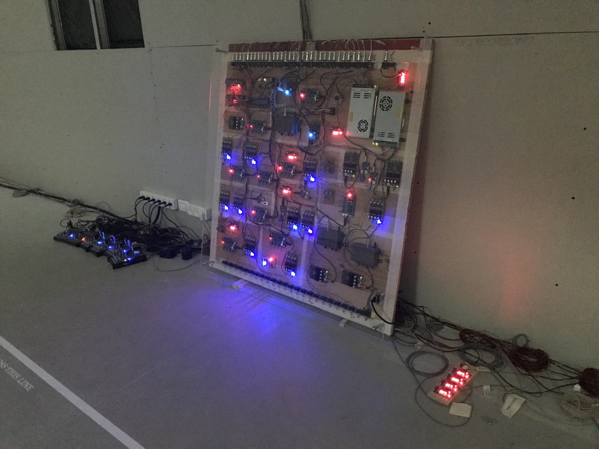 Numerous elements and clocks are suspended and installed in the darkened exhibition space, from a telephone receiver to a ram’s horn, including a wooden spoon and twig, electronic vacuum cleaner, watch, drum, and chair. Vein-like electric wires connect the objects.