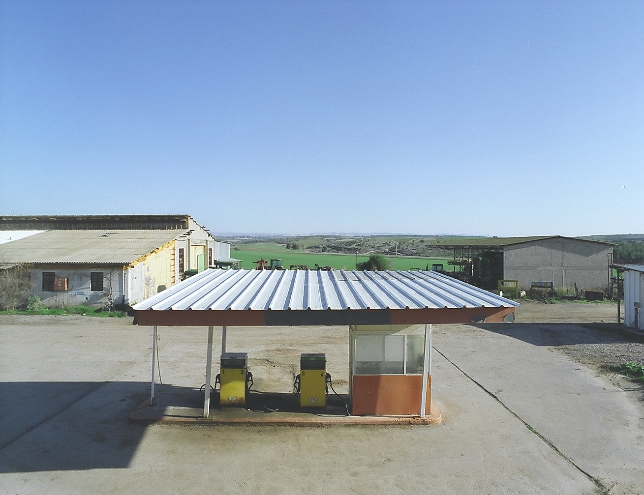 Two gas stations, at Gal-On and Eilaboun, are photographed in full daylight, in utter opposition to the shining expanses of the nighttime gas stations. Gal-On’s station, consisting of two pumps and a shed, is functionality pared down to the necessary essentials in a visual rejection of car culture reinforced by the open, green landscape facing it, encoded with memories of bygone eras. The Eilaboun gas station is under construction, without the pumps, showing only its outer shell as hollow decor.
