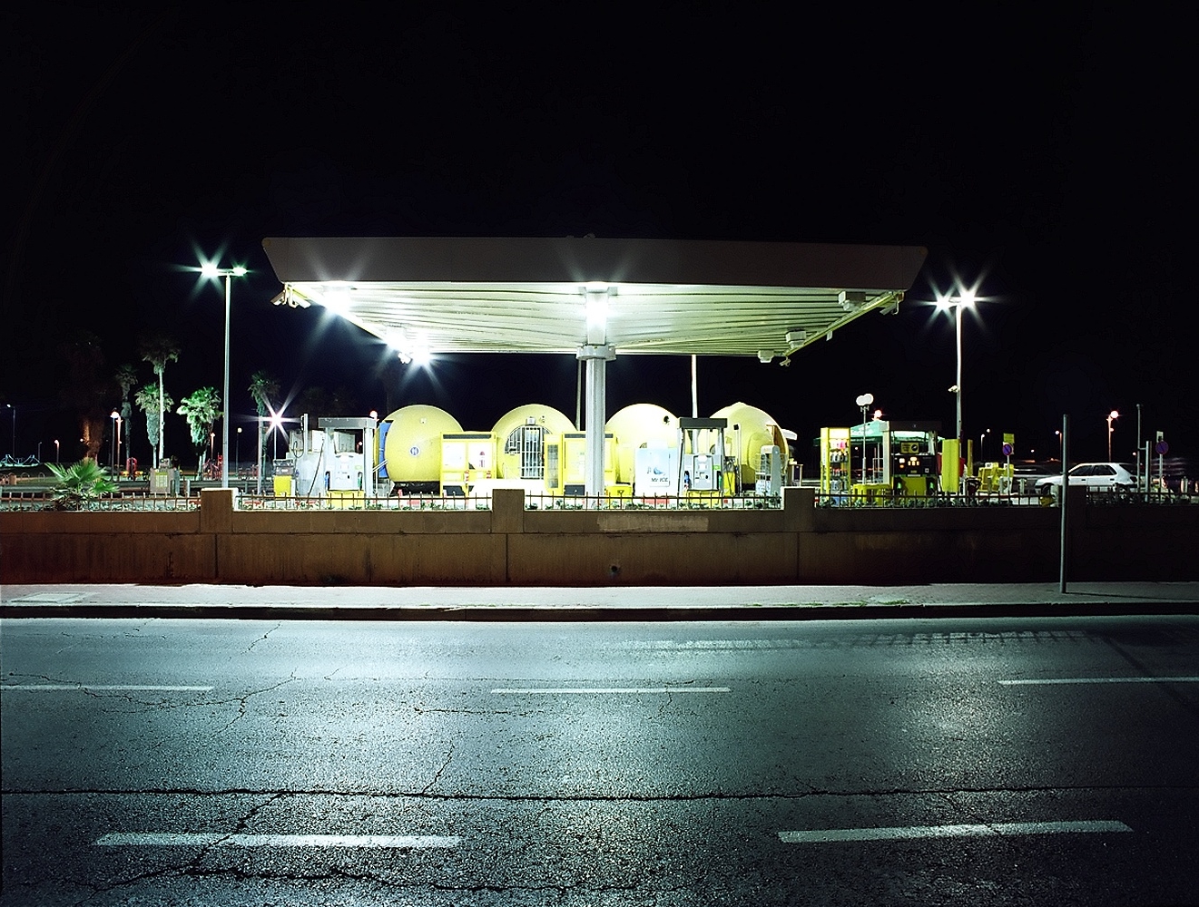 Within the broader context of Saul’s work over recent years (photographs of greenhouses and mediating spaces stretching between nature and farming areas and the suburbs, and a recent project focusing on Jerusalem’s outskirts), the act of enlightenment and the blinding light are associated with revisiting the possibilities of observation and examination. In most of the works the gas stations look like lightships which will disappear to be swallowed up by the darkness, as images quickly formed and quickly dying. Saul freezes memory, stilling the short moment in which the traveler-nomad observes the stations, unless to stop.