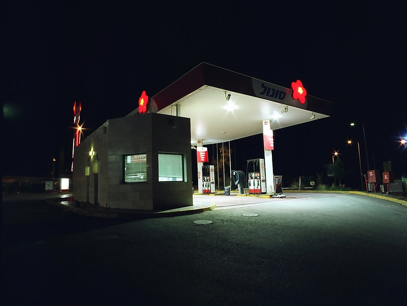 נקודת הראות של שאול היא מהדרך, זו של הנוסע במסע שפעמים רבות כל כך הוא העיקר ולא הנקודה שבסופו. כך, שאול מצלם תחנה של “דלק” ממרחק, מזווית אלכסונית נמוכה כמי שהגיע אליה כמו עולה רגל. הרחבה הבהירה המסמאת היא ניגוד מושלם לשמי הלילה בשחור קטיפה. מזווית דומה צילם גם תחנה של “סונול” שפרח מתקתק מתנוסס מעליה כמו צלב. בתחנה אחרת אור ניאון ירקרק מאיר כמו אור של חסד, מסתורין וישועה. באור הניאון, בעיצוב שמבקש להעלים את היות הדלק גורם לנזק מתמשך לסביבה, התחנות מבטיחות הבטחות שווא.