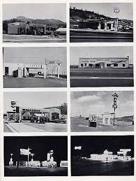 Saul emphasizes the repetitive physical pattern of stations: pumps, overhead shelter from the sun and rain, and parking places -an efficient, modernist paradigm of car culture and movement as the embodiment of freedom. Gas stations, as “pit stops” for refueling and refilling basic human needs for food, drink and rest, are designed as promises with their glimmering shade shelters and star-like lights.