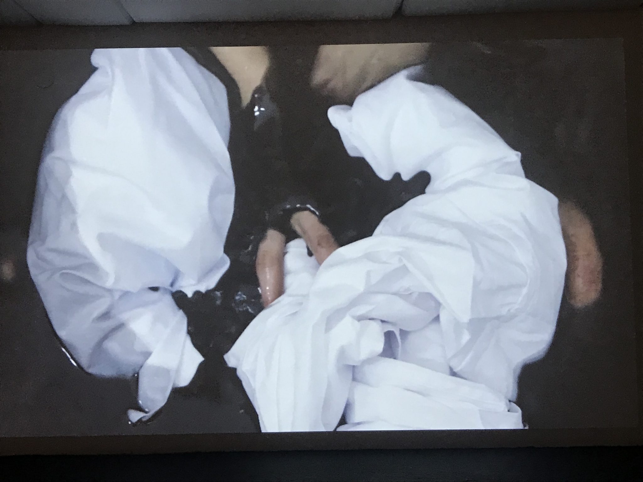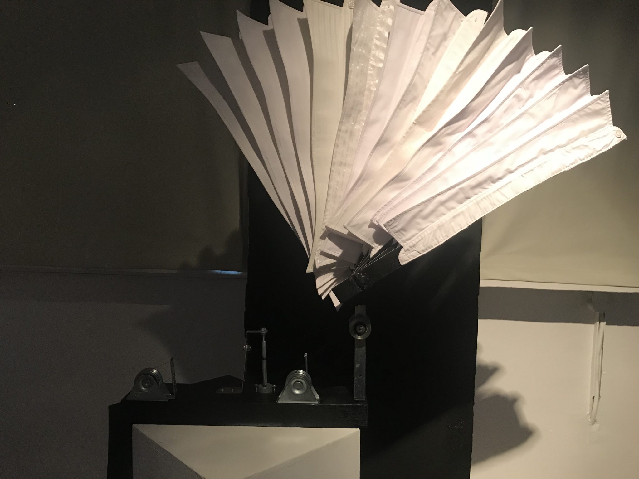“In the Name of the Father,” Adva Raz’s video installation with objects, a virtual solo exhibition, is excellent. Raz, who lost her father last year, creates a series of personal texts referring to the Jewish ritual washing of the body and mourning customs, as well as the desire to recreate the contact, to express her yearnings when faced with the inconceivable finality of death. Raz puts her father’s prostheses on her own legs, blackens his white shirts with black water, changing his starched white collars into kinetic objects forming a mechanical fan. The works correspond with works by leading artists, especially Rebecca Horn’s fan of feathers. The similarities do not detract in any way from the solid aesthetics Raz proposes. I am curious to see what Raz creates in the future.