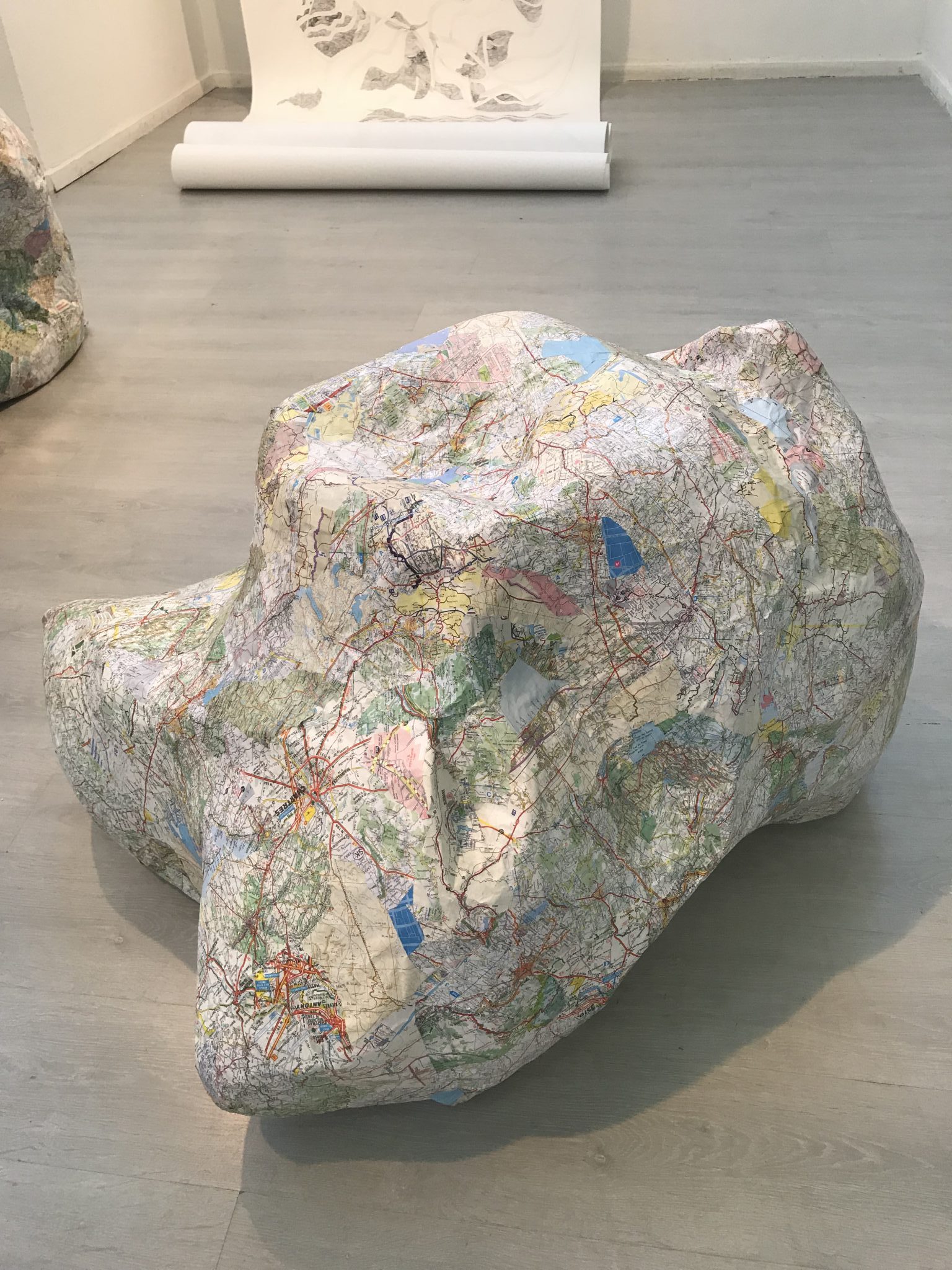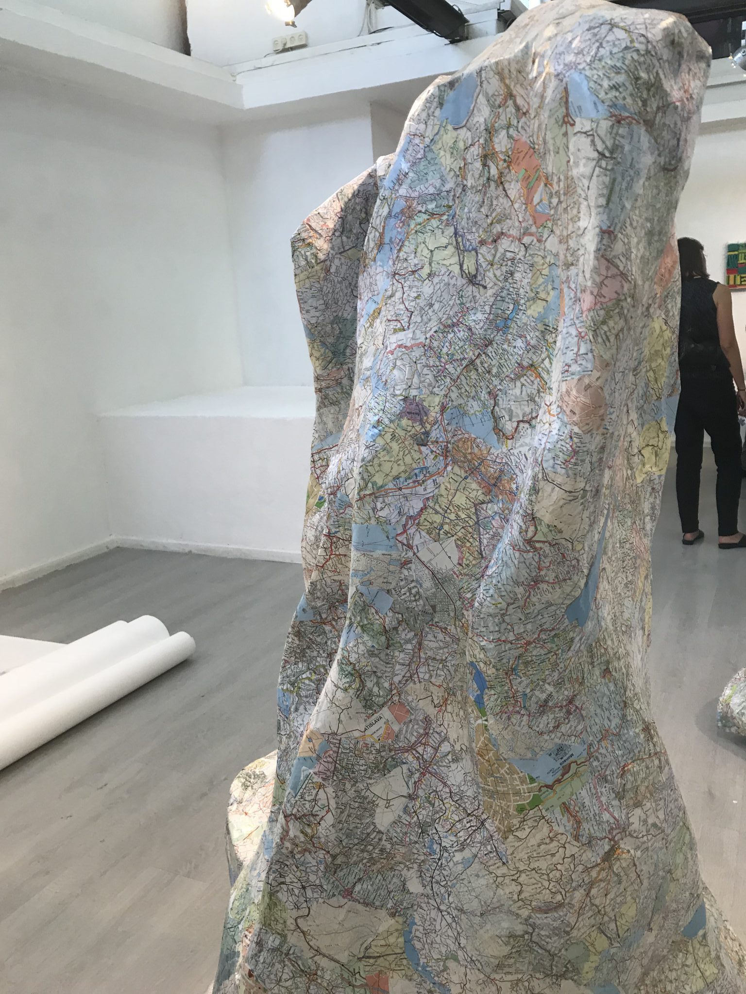 Ophira Spitz made large amorphous sculptures whose surfaces are cutout maps, impressive in the way she unified the shapes with a visual text expressing the “scientific” ability to perceive the world. The works are based on a longstanding tradition of using cartography in contemporary artworks, such as by Alighiero Boetti, Rikrit Tiravanija, or Grayson Perry. There is also a visible link to Etti Abergel’s works.