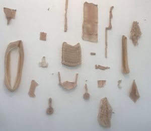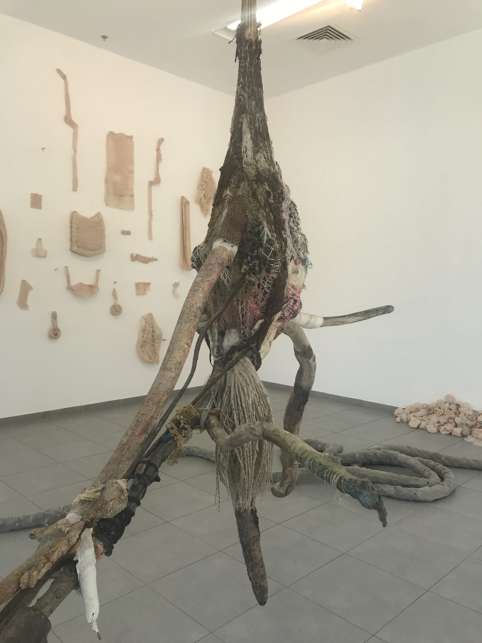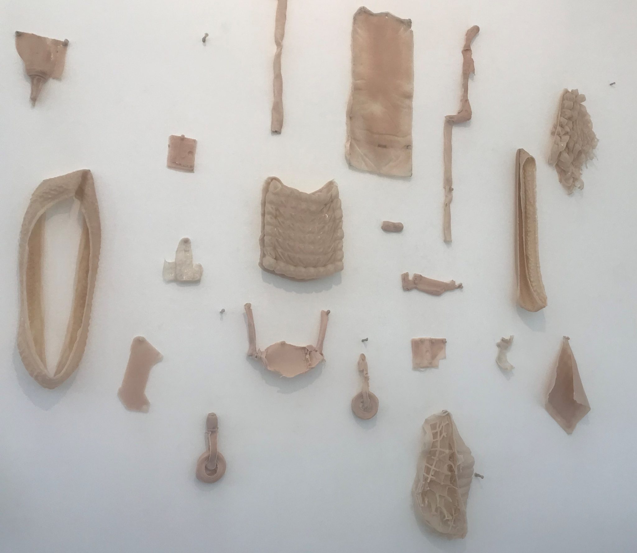 The material looks like soft flesh, with the pieces hanging on the wall creating a chilling effect.