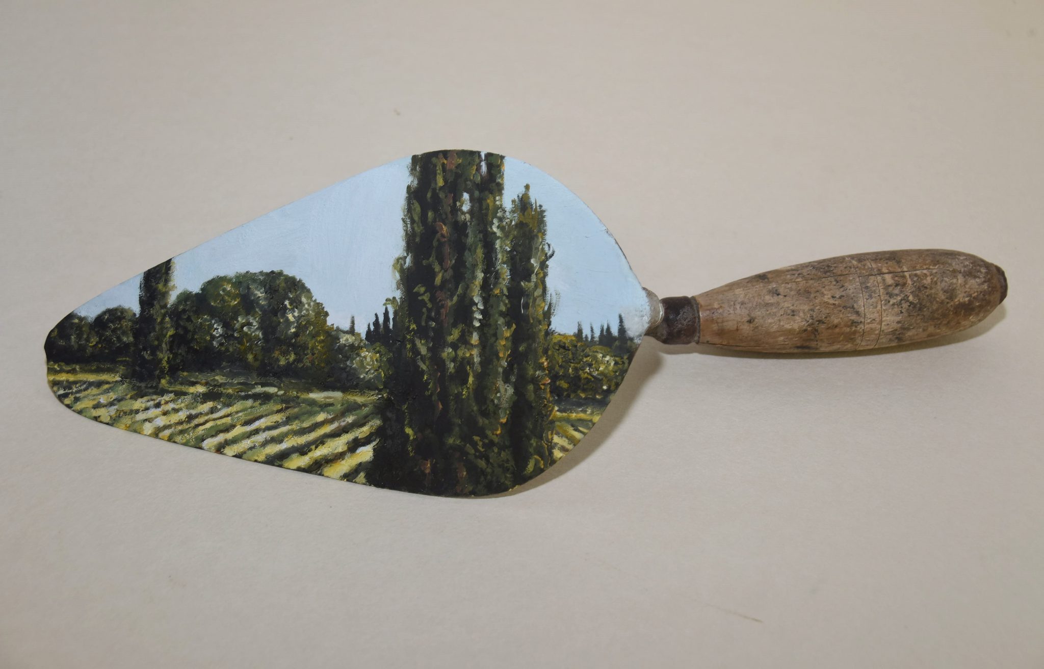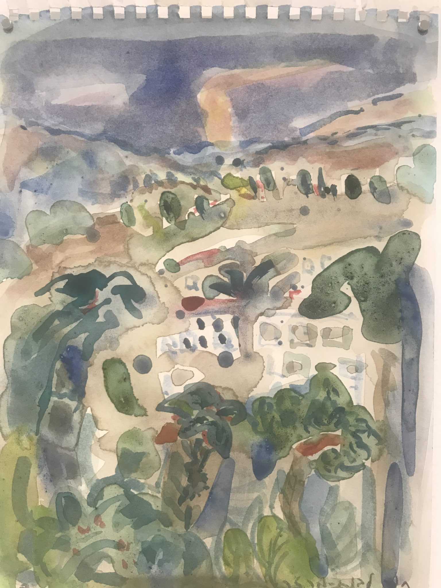 The works in the exhibition are extremely diverse in quality. Some of the works that stand out are watercolors by Muriel Bentwich from the 1940s, and Chava Livnat Merzer’s landscapes of northern Israel (one is dated 1980). Margot Gran’s interesting paintings look like ink drawings. Haya Graetz Ran is exhibiting two lovely works painted on objects, while Hadar Gad’s Jezreel Valley (2012) is an impressive work, the only one capturing the breathtaking quality of landscape and the moment in which one feels overwhelmed standing before a view. Gad’s work, whether due to its size or the places in which she ceases to describe reality, correspond with the history of the Romantic landscape of the 19th century, especially American painters such as Thomas Cole.