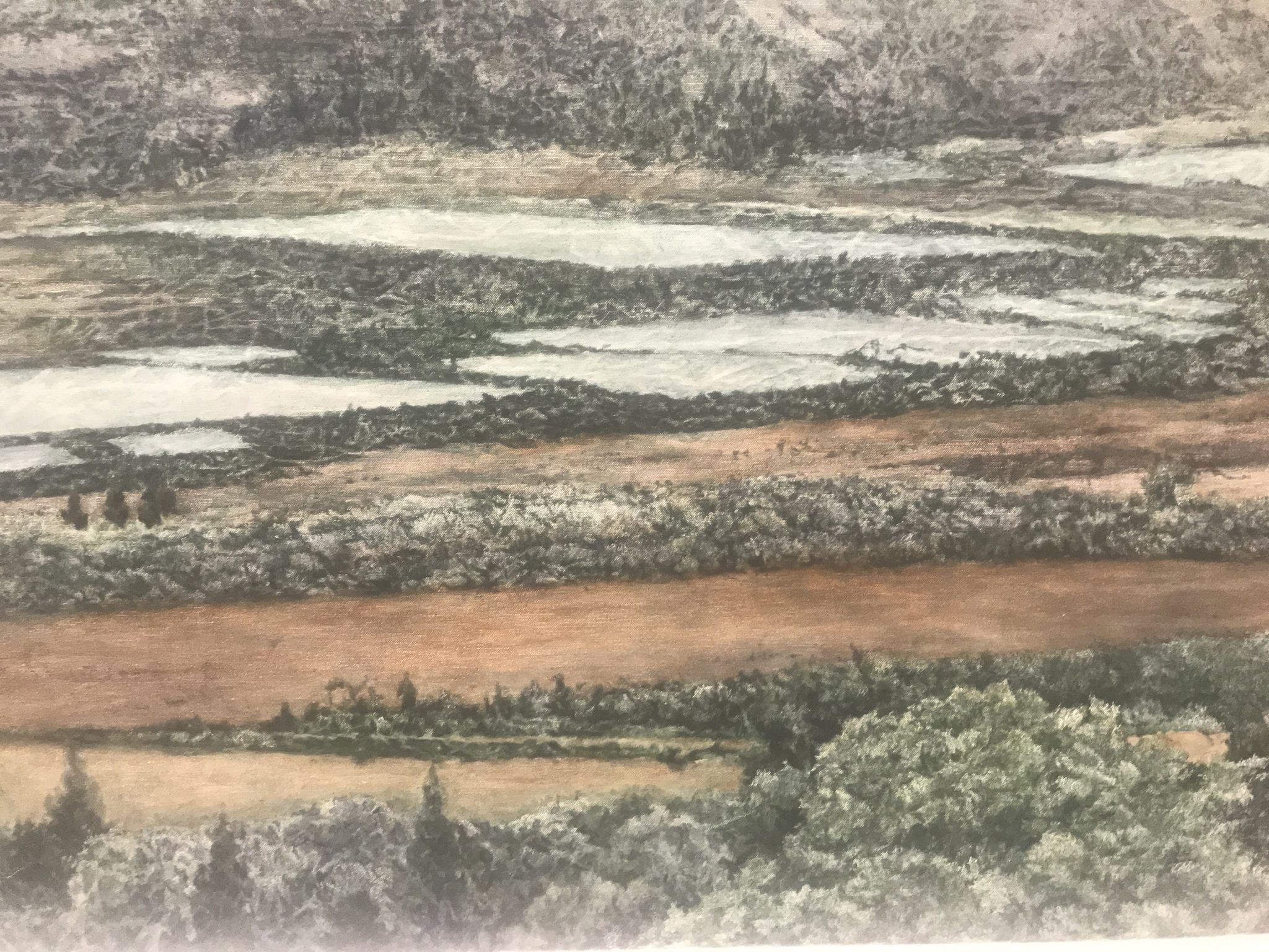 בין העבודות בולטות עבודות אקוורל ,טכניקה שאינה מוערכת דיה, של מיוריאל בנטוויץ משנות ה 40, של חוה לבנת מרזר שציירה את נופי צפון הארץ (עבודתה המתוארכת היא משנות ה 80) ועבודות כהות ומעניינות של מרגו גראן שנראות כרישומי דיו . חנה נוה מוצגת עם עבודות שמן אפלות שמציעות פרשנות פחות שכיחה של נוף . חיה גרץ רן מציגה שתי עבודות יפות המצוירות על אובייקטים :”נוף העמק ” 2017 על כף טייחים ו”ערכת הנוף” 2014 העשויה בקופסת מעבדה ביולוגית שהשתמרו בה רשימות. “נוף עמק יזרעאל”, 2012 של הדר גד, היא עבודה מרשימה, והיחידה בתערוכה שתופסת את האיכות העוצרת נשימה שיש בנוף, את הרגע בו הוא משרה ענווה אצל העומדים מולו . הציור של גד, גם בזכות גודלו וגם בשל המקומות בהם הוא נפרד מתיאור מציאות, מתכתב עם ההיסטוריה של ציור נוף רומנטי של המאה ה19, במיוחד האמריקאי כמו של תומס קול הבריטי- אמריקאי.