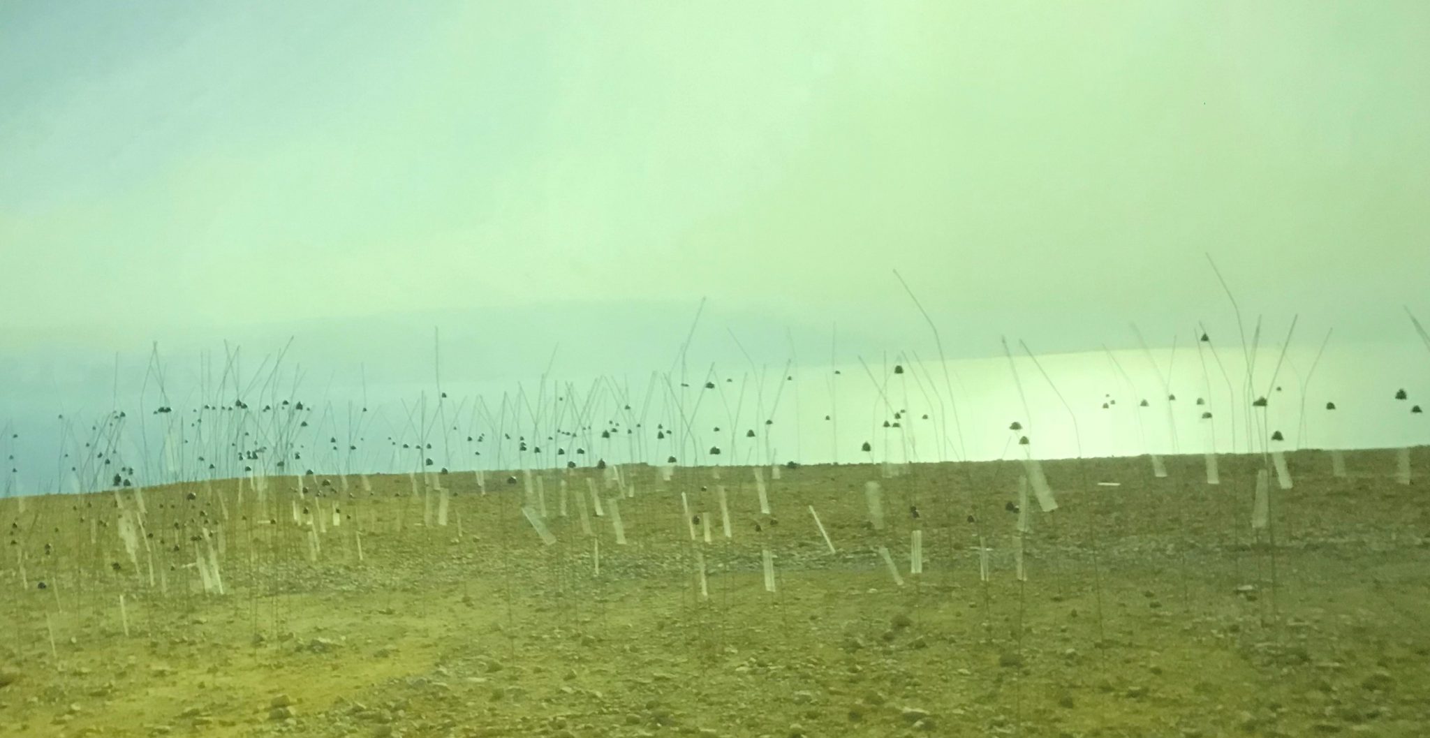 In his video Animitas [Small souls] (Dead Sea), 2017, Boltanski walks a fine line between kitsch and art but does not succumb. The work is delicate, with transparent passion like a prayer for peace of mind. The 12-hour long work was filmed on a cliff overlooking the Dead Sea. It depicts 300 Japanese bells, metal stakes on which Plexiglas plates were hung in the shape of the constellations on Boltanski’s day of birth, and filmed in natural light.